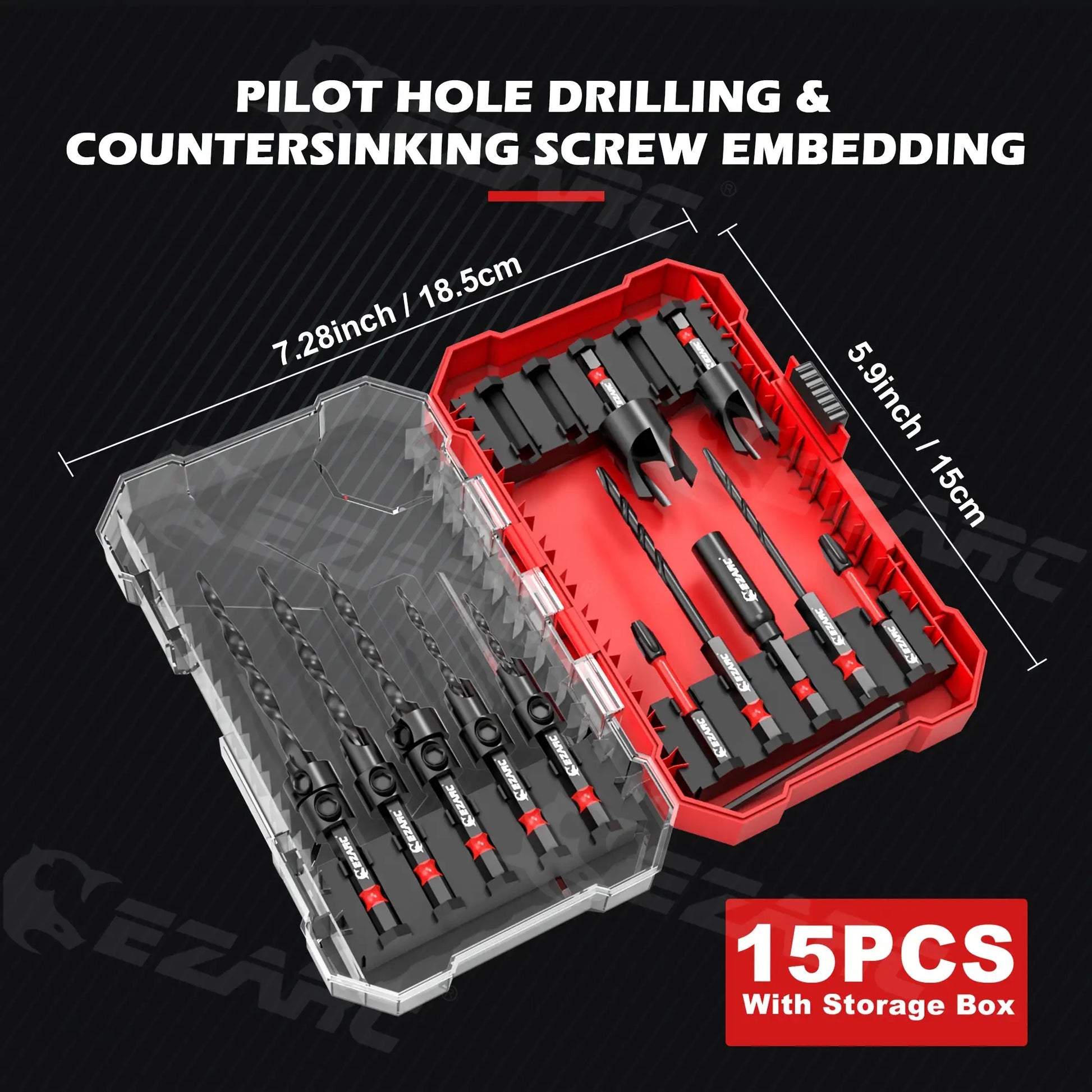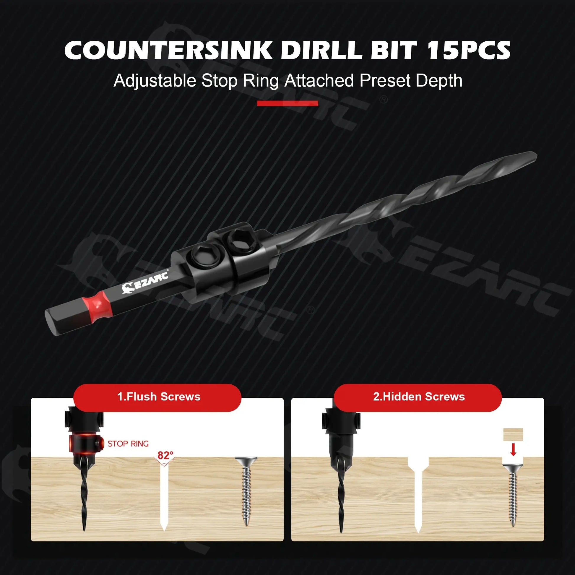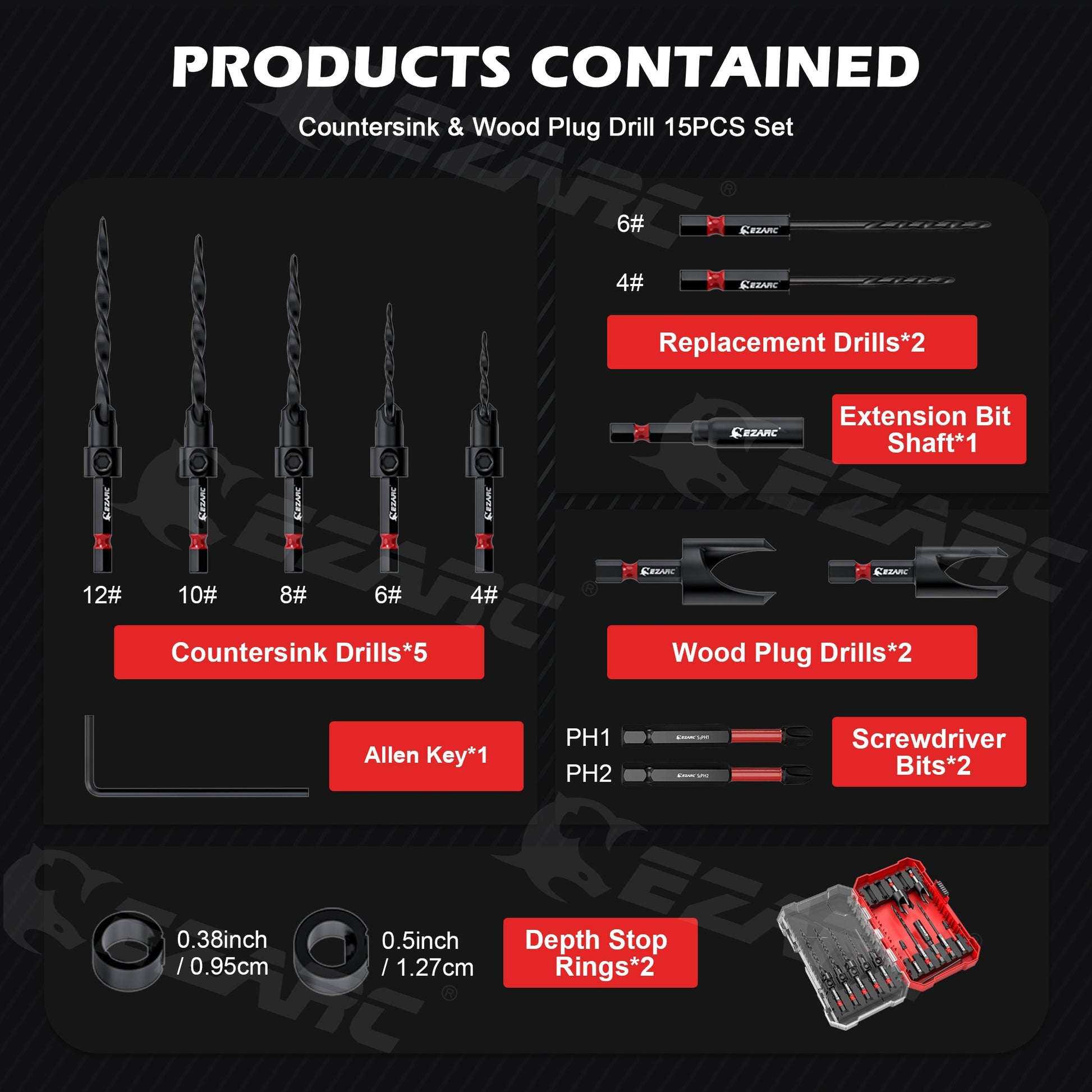 Complete Woodworking Solution: The EZARC 15pc countersink drill bit set includes everything needed for your wood projects—7 tapered drill bits ( # 4 to # 12), 2 wood plug cutters (3/8" and 1/2"), an Allen key, 2 depth stop rings (3/8" and 1/2"), 2 Phillips screwdriver bits (PH1 and PH2), and an extension bit shaft.