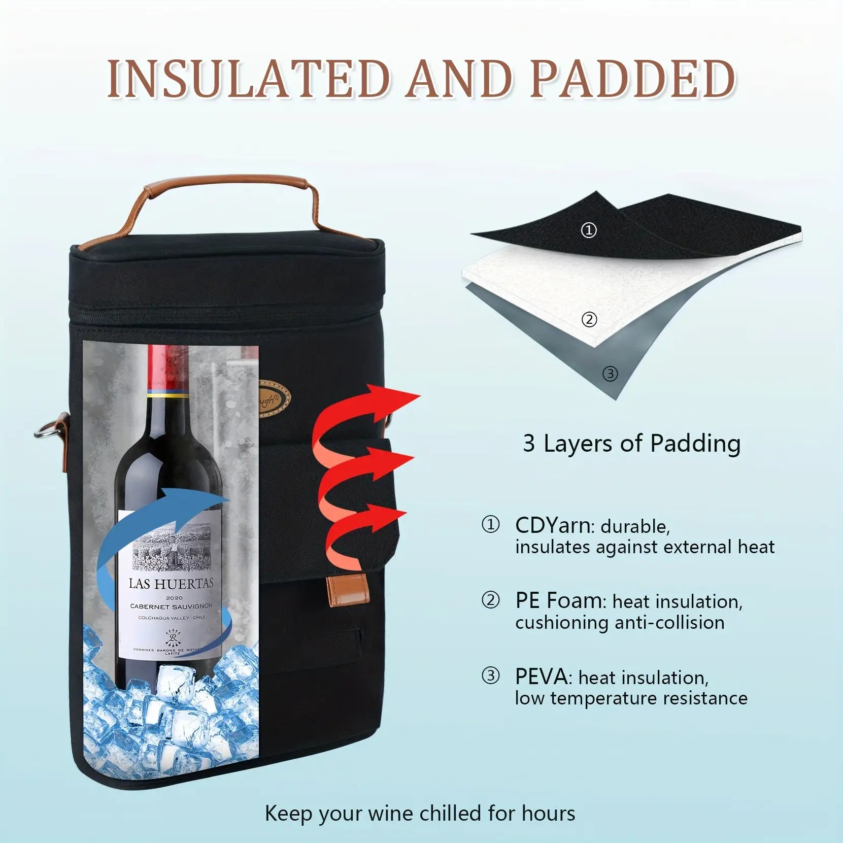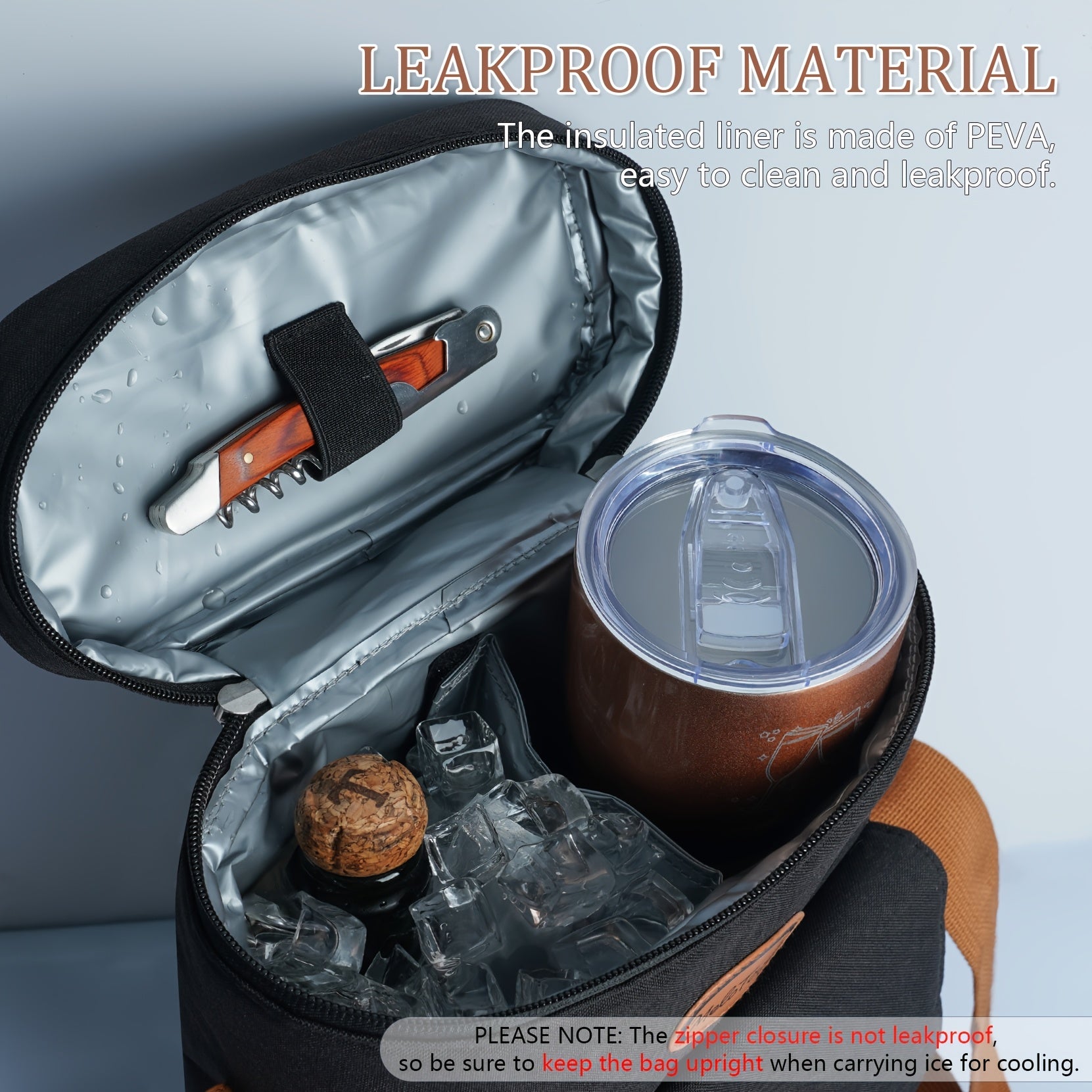 Our insulated wine cooler bag maintains the ideal temperature for your wine for extended periods.Perfect for transporting wine to bars, restaurants, picnics, camping trips, or road journeys, this side bag features three layers of insulation to keep your glass bottles, chilled wines, frozen spirits, and cold beers at a consistent temperature.The PEVA leakproof lining prevents spills and is simple to clean, making it an essential accessory for wine enthusiasts on the move!