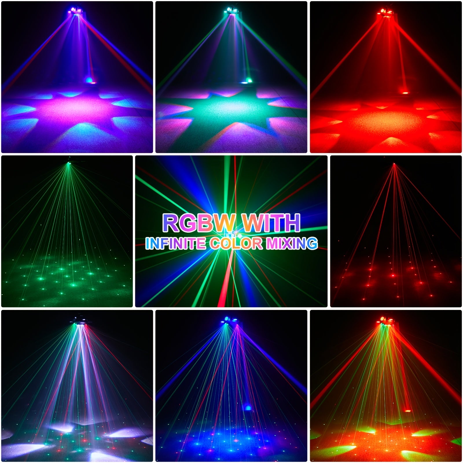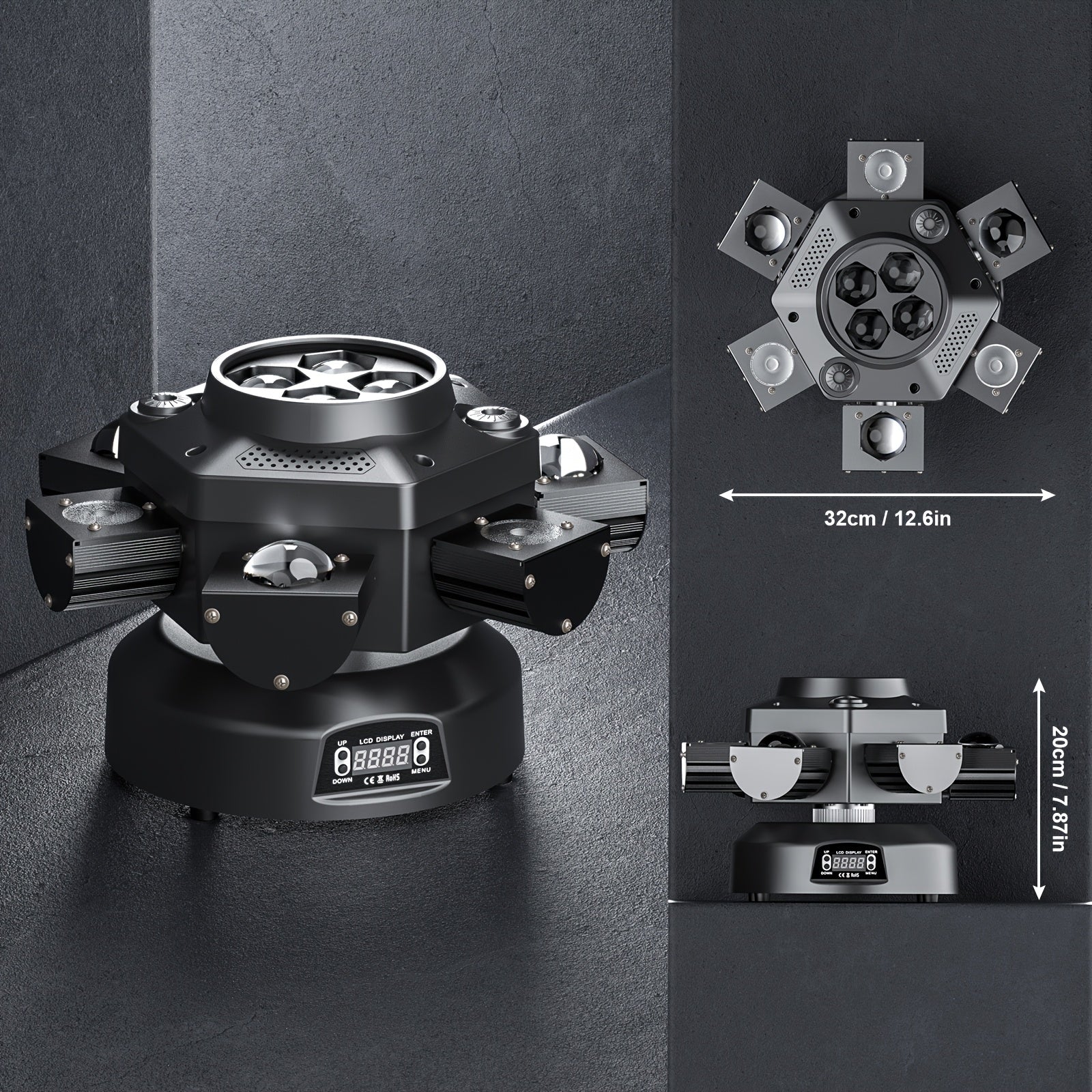Shade: Dark Substance: plastic casing Features: 1. Red and green starry sky display 2. 360° endless bee eye, limitless color blending 3. 3-arm 4-in-1 beam with 180° rotation, endless color blending 4. 3-arm 4-in-1 fixed direction coloring effect, limitless color blending Flashing: 0-20Hz X axis: 540° Y axis: 180° (The three colored arms remain stationary)