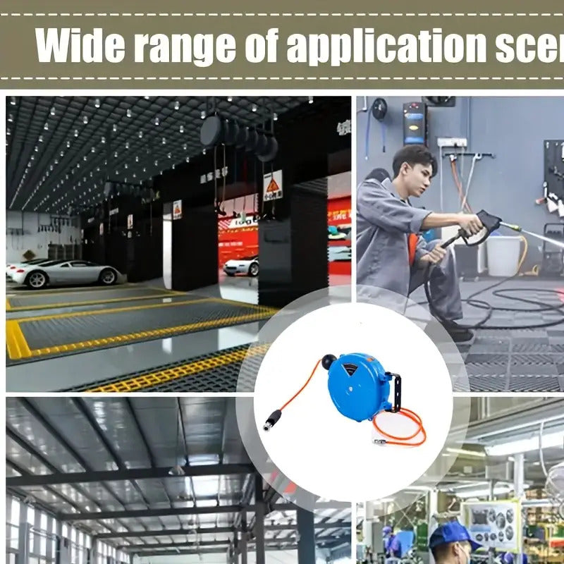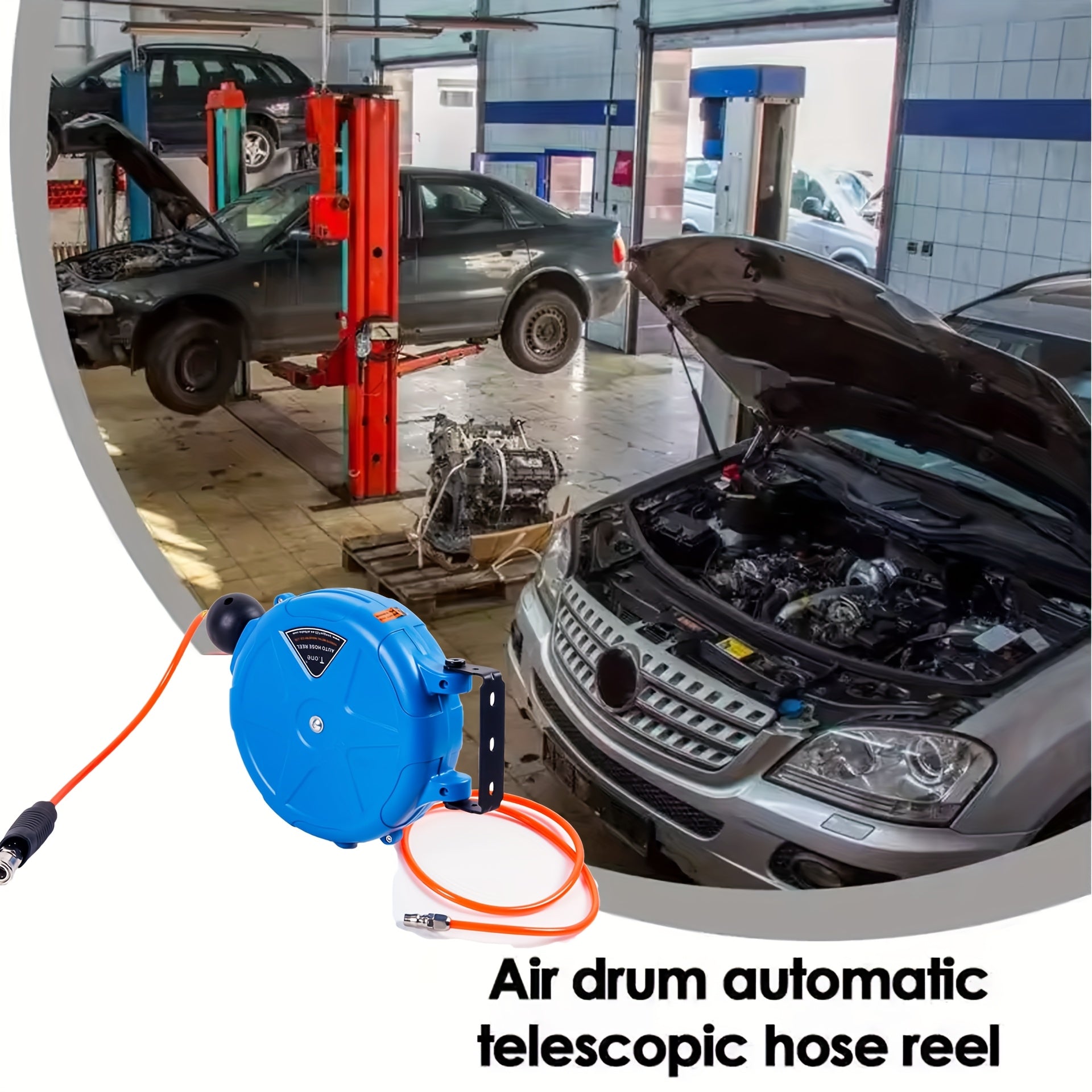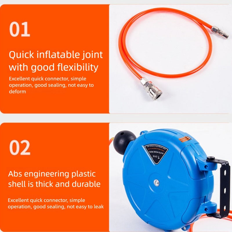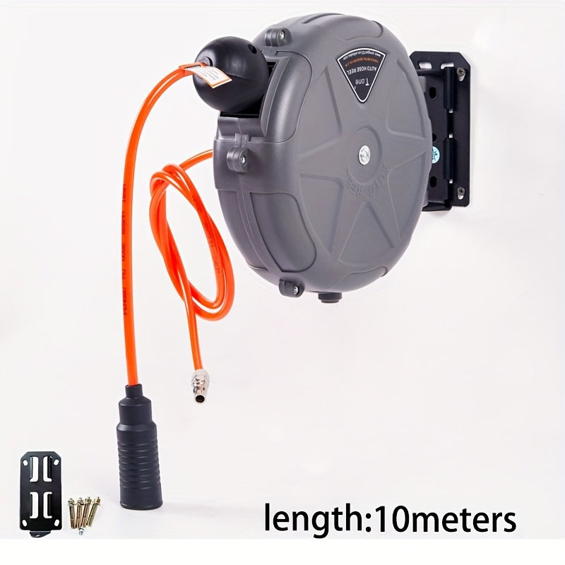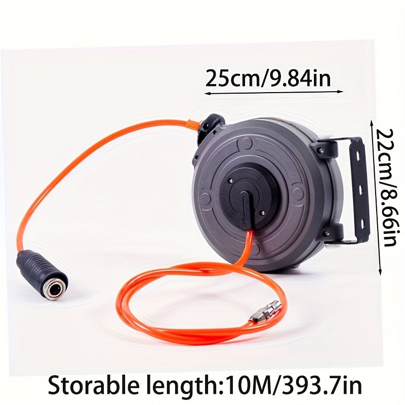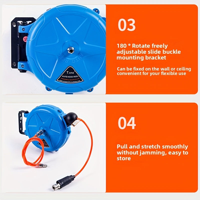 Key Points: 1. Seamless Reliability: The air hose reel features an integrated design with an automatic locking mechanism, ensuring easy stability and extending the lifespan of the compressor hose, providing exceptional reliability. 2. Exquisite Craftsmanship: Our air hose reel is equipped with a powerful rewind spring for easy winding and unwinding, effectively preventing tangling. It can be easily stored even after repeated use, maintaining good tension. 3. Sturdy Shell: Our air hose reel is designed with a robust impact-resistant shell and well-sealed internal connectors to prevent air leaks, allowing for easy tool operation. The durable closed PP shell ensures maximum reliability and longevity. Specifications: Material: ABS Hose Material: PU Hose Free Adjustment: 180° Product Dimensions: Length: approximately 10 meters/393. 7 inches and 6 meters/236.. 33 inches Operating Temperature Range: 10° to 50° C Package List: Automatic retractable hose reel *1 Screws *4 Clips *1 Notes: 1. Due to lighting effects and shooting angles, there may be color differences in the product, please understand. 2. Due to manual measurement, there may be errors in product dimensions.