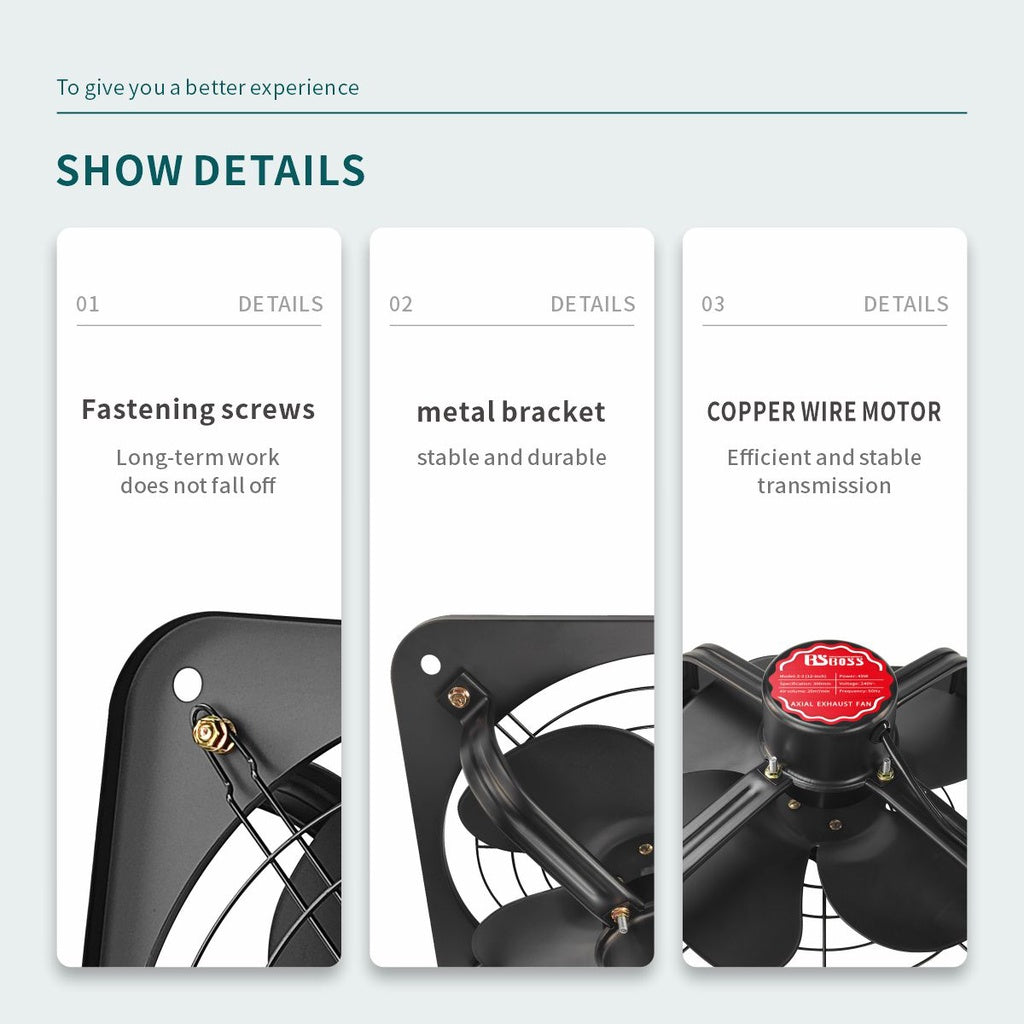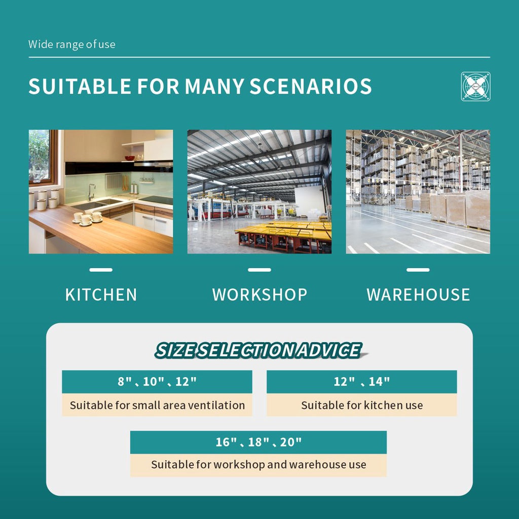 RED FAN BLADE Specifications: 10" industrial exhaust fan Panel size (L*W*H): 290*145*290mm Hole distance: 240mm Inner diameter: 263mm Power: 38W Air volume: 17 M³ /min Speed: 1224 r/min Noise: ≥ 55 dB(A) Product weight: 1. 44kg Specifications: 12" industrial exhaust fan Panel size (L*W*H): 350*145*350mm Hole distance: 300mm Inner diameter: 315mm Power: 45W Air volume: 20 M³ /min Speed: 1240 r/min Noise: ≥ 58 dB(A) Product weight: 1. 74kg