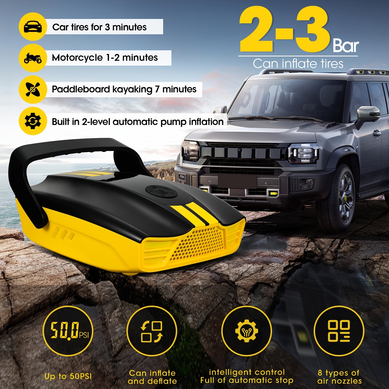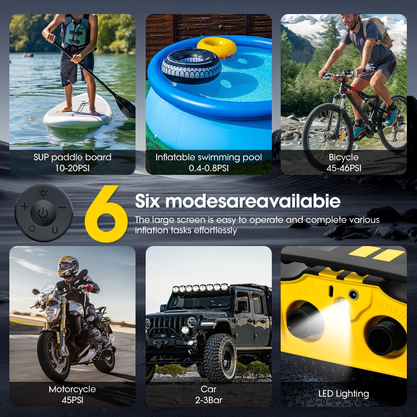 The third mode of car tire inflation mode: outputting 0-3.1 Bar with a prure of approximately 50 PSI, suitable for all household cars, SUVs, and other car tires.Not applicable to truck tires.The fourth mode of motorcycle tires: outputting 30-50PSI air prure, suitable for motorcycle tires.The 5th inflation mode bicycle tire; Output 30-50PSI air prure, suitable for bicycle, mountain bike tires, and other types of bicycle tires.Not suitable for road bicycle tires.If there is no operat