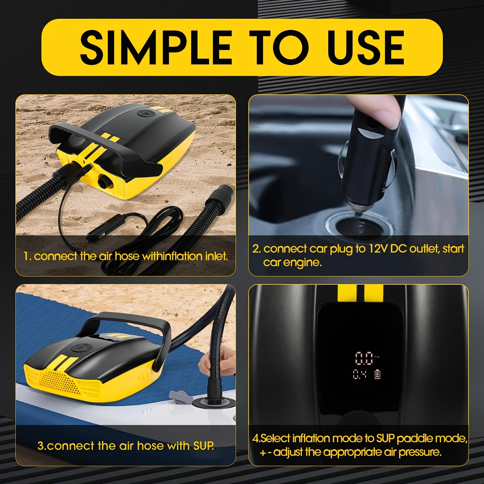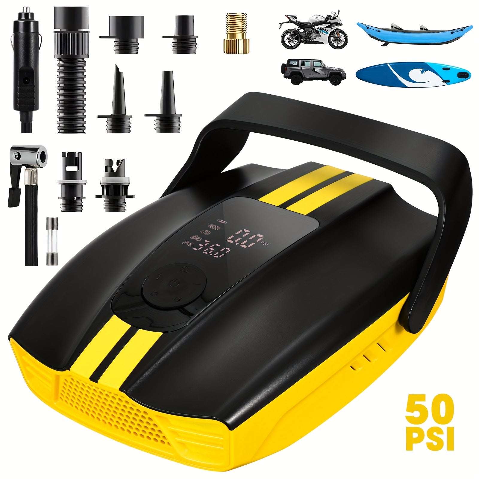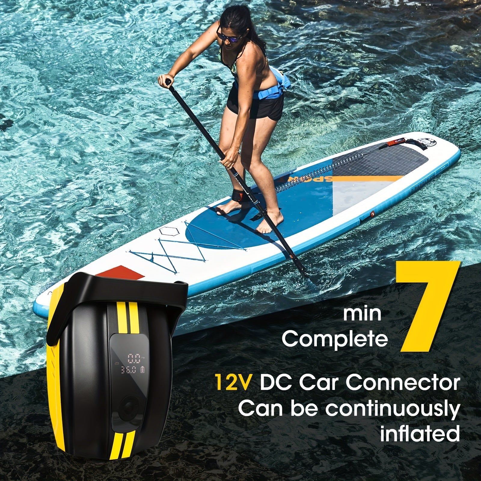 FreeLionVon SUP inflation pump, a 50 PSI two-stage high-prure and low-prure all-in-one inflation pump, suitable for inflating SUP, kayaks, air mattres, tents, swimming rings, car tires, motorcycle tires, bicycle tires, etc.Product weight: 2150g Shell material: ABS Power supply mode: 12V DC car connector.The maximum adjustable prure of this product is 0-50 PSI, 0-3.1 Bar.
