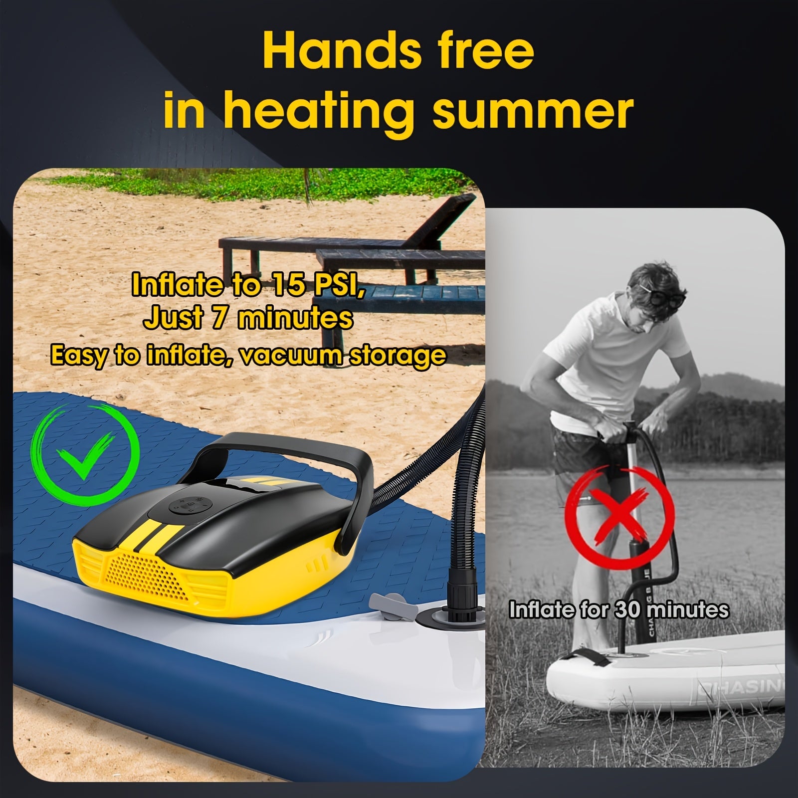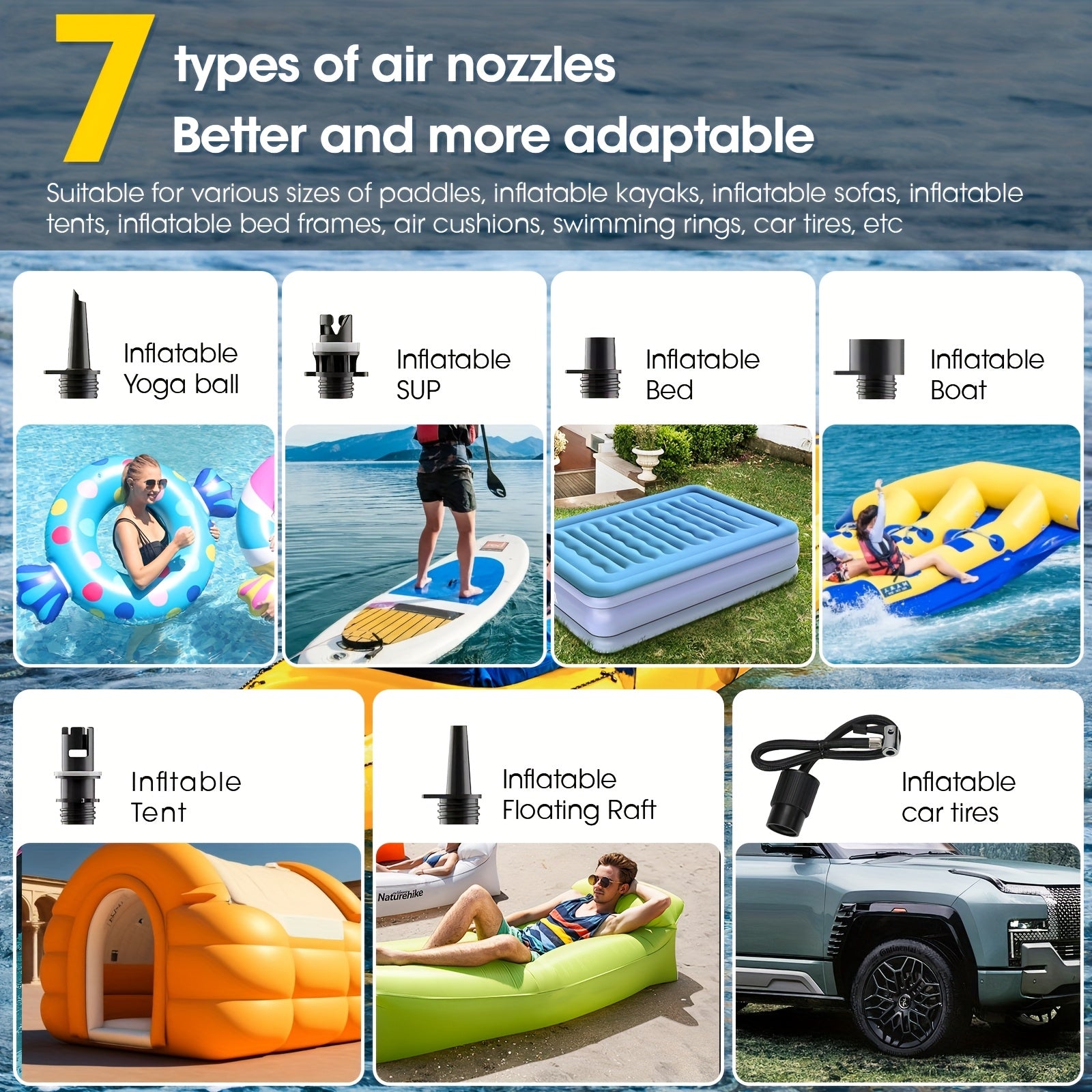 5 inflation modes to choose from; The first mode is SUP paddle board mode, which outputs 1-20PSI to inflate SUP paddles, kayaks, assault boats, boats, inflatable tents, etc.The second mode is low-prure mode, with an output of 0.4-0.8 PSI and a prure of about 5.5 kPa, which can inflate inflatable beds, air cushions, inflatable swimming pools, swimming rings, etc.In this mode, it is set to automatically shut down after 3 minutes of use, and can be restarted if necary.