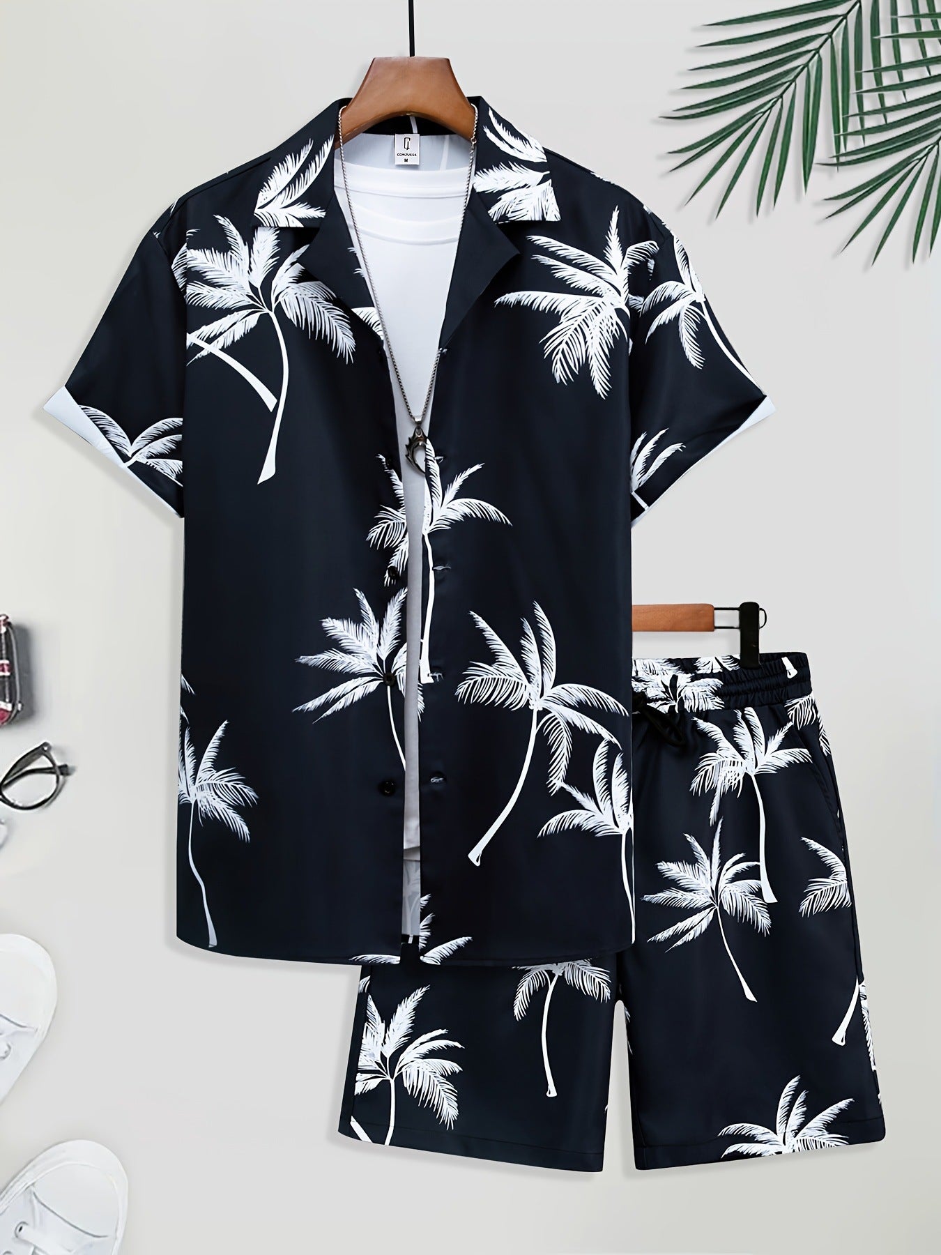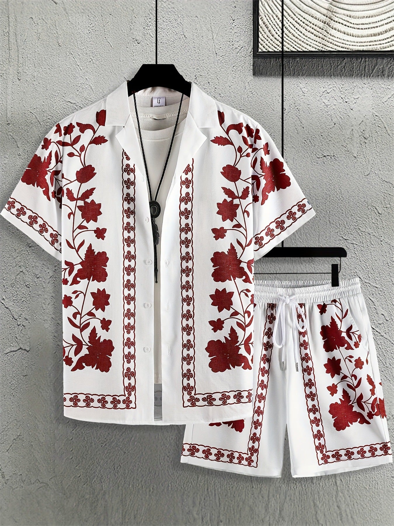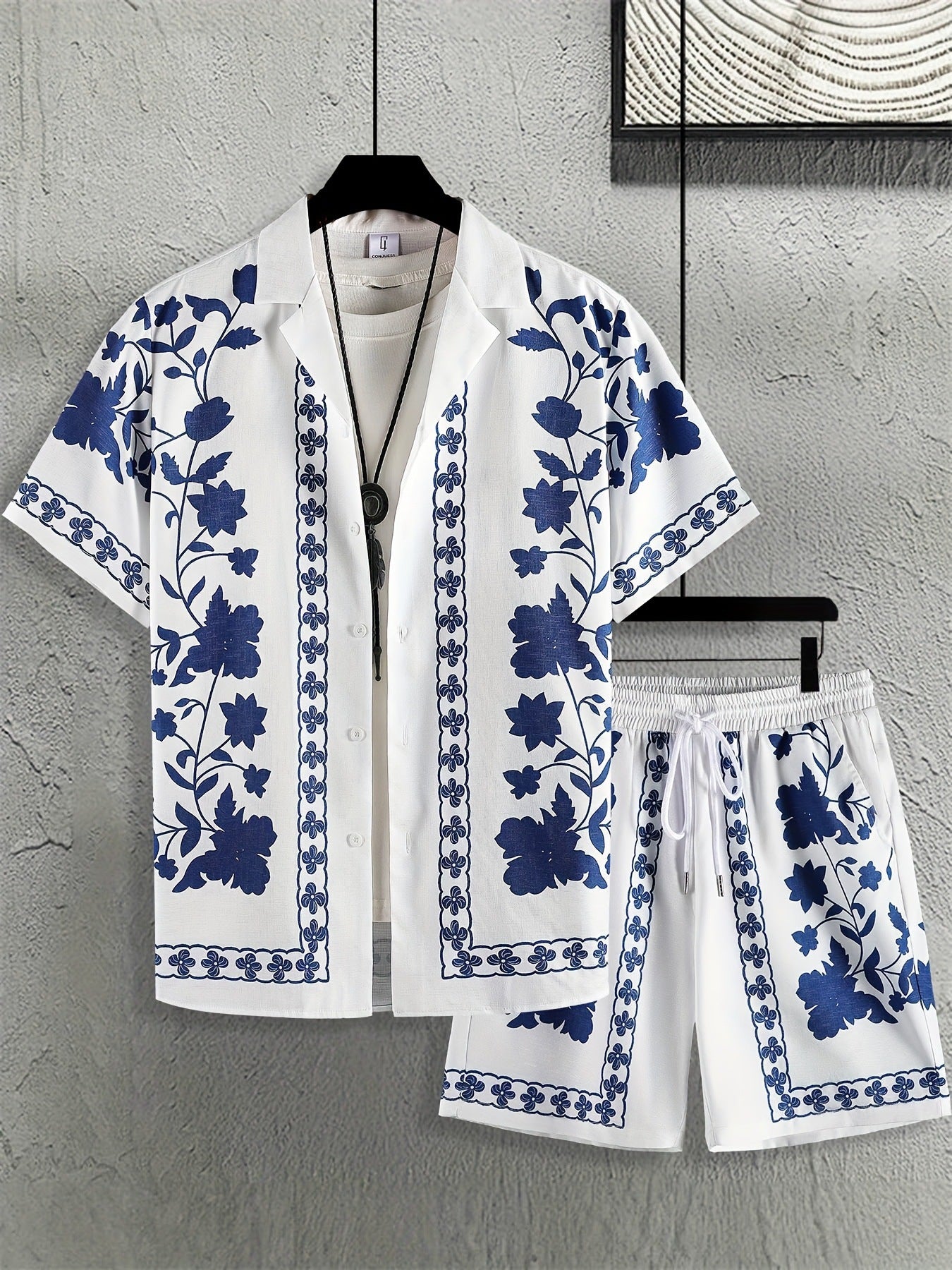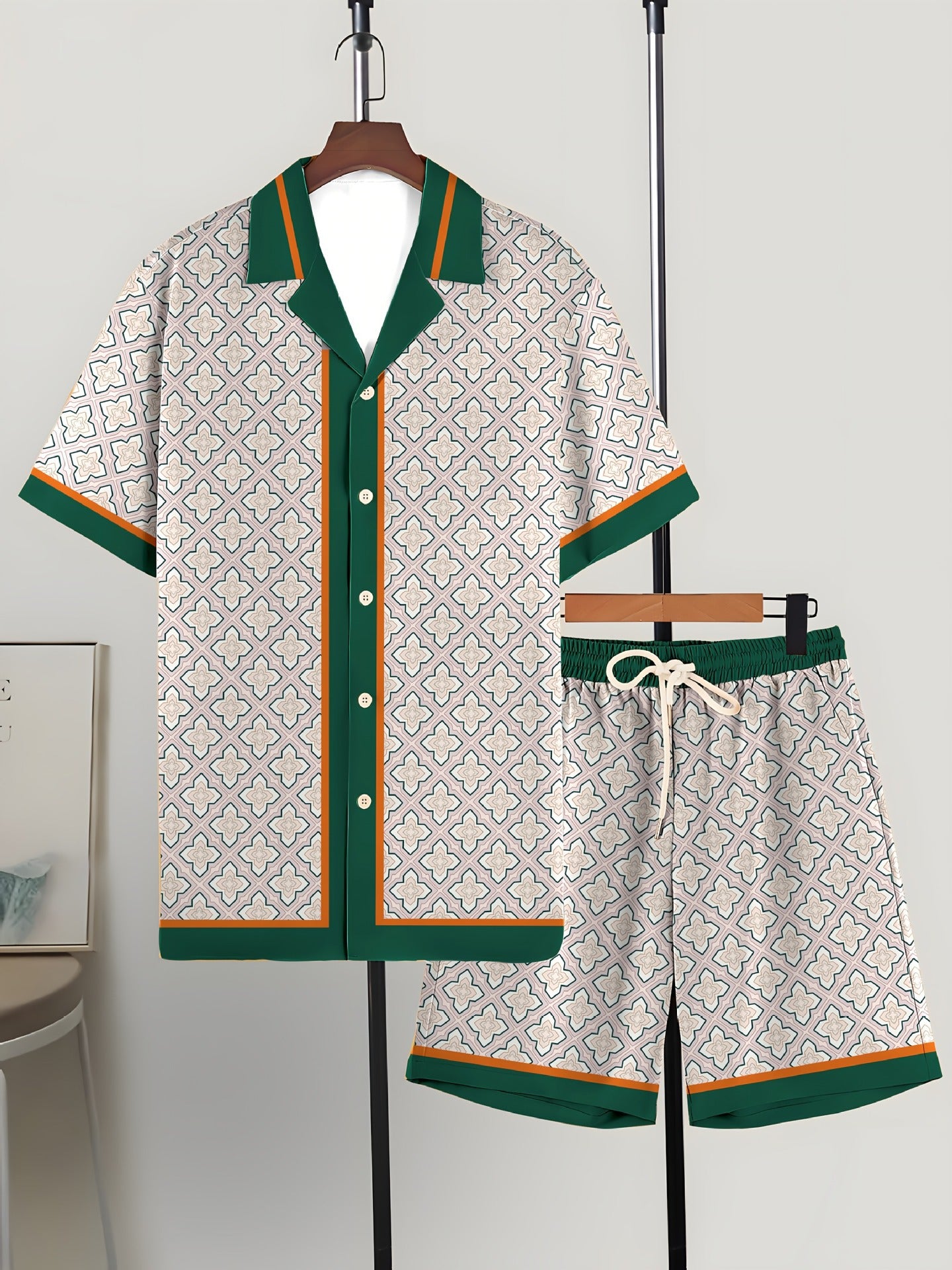 Summer Men's Cuban Collar Shirt Short Sleeve Shorts Set