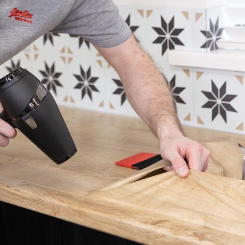 Overlap the vinyl wrap film a few mm to allow for shrinkage when joining on a worktop for example