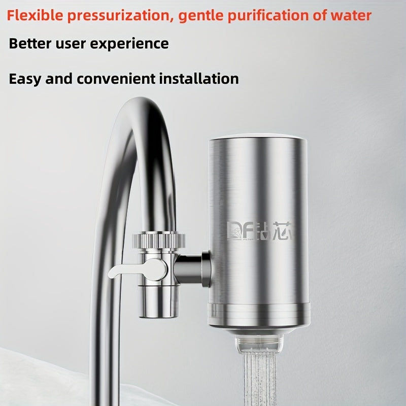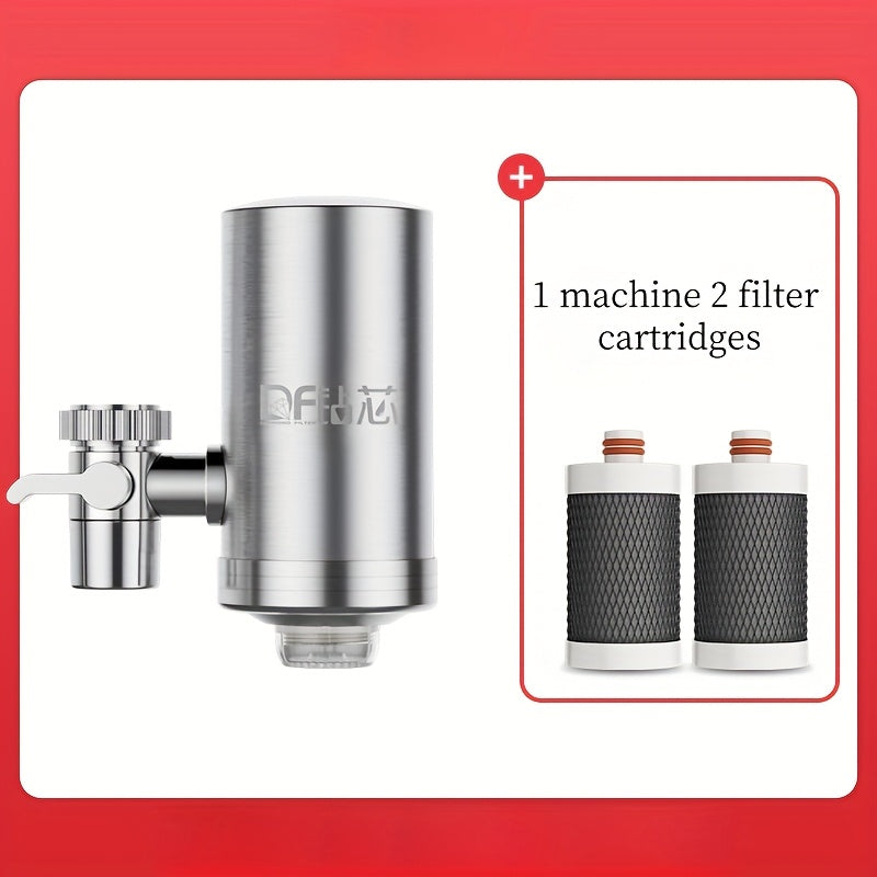 This is a water purification system for faucets that includes two built-in anti-scaling filter components, constructed from stainless steel, compatible with different types of faucets, and simple to set up. The filter cartridge should be changed every three to six months.