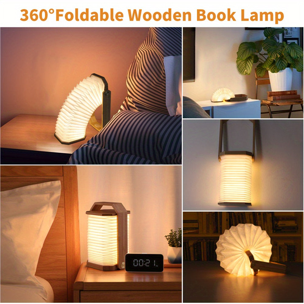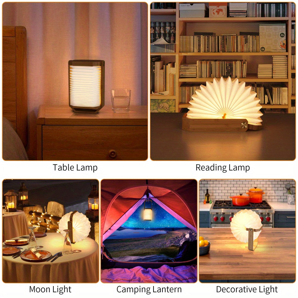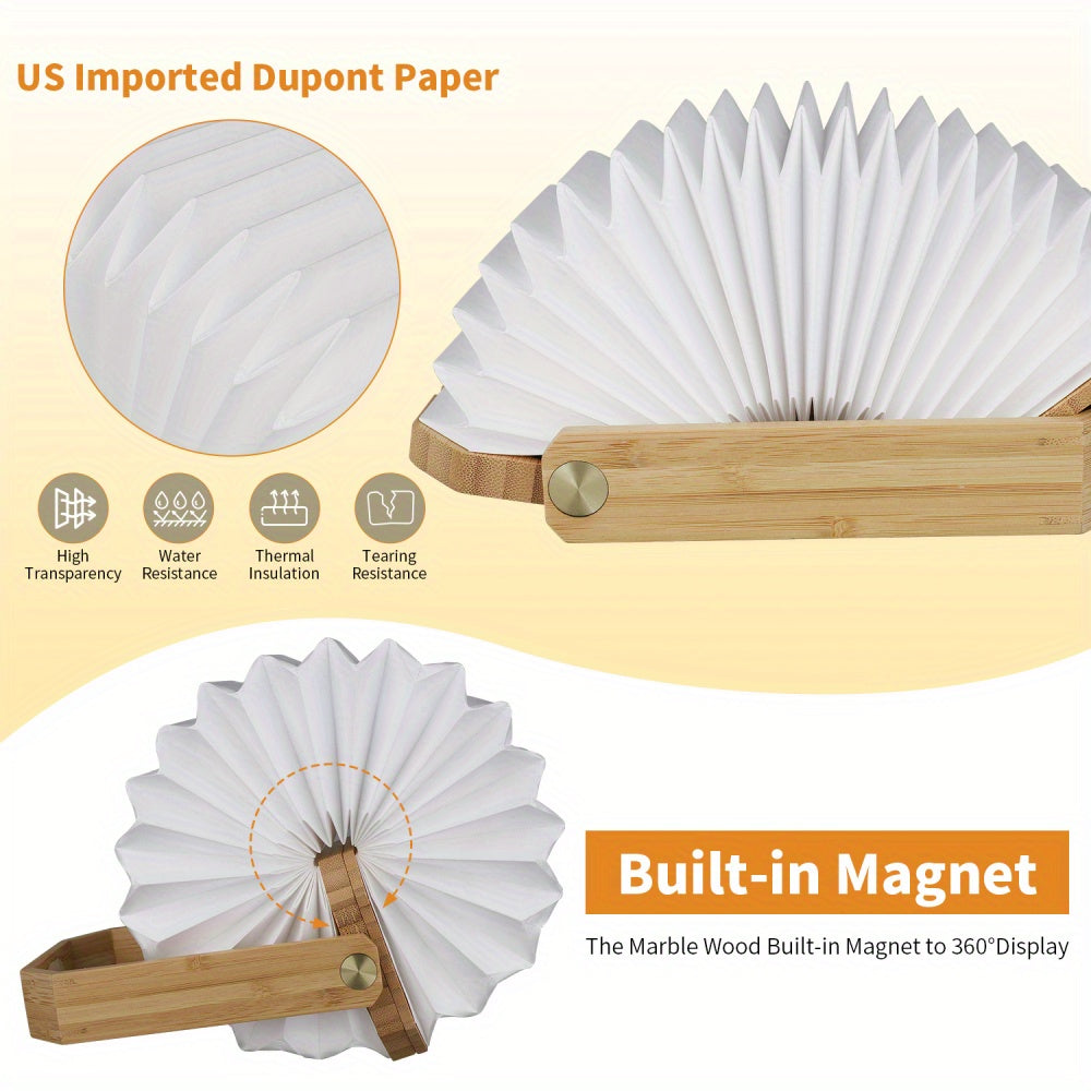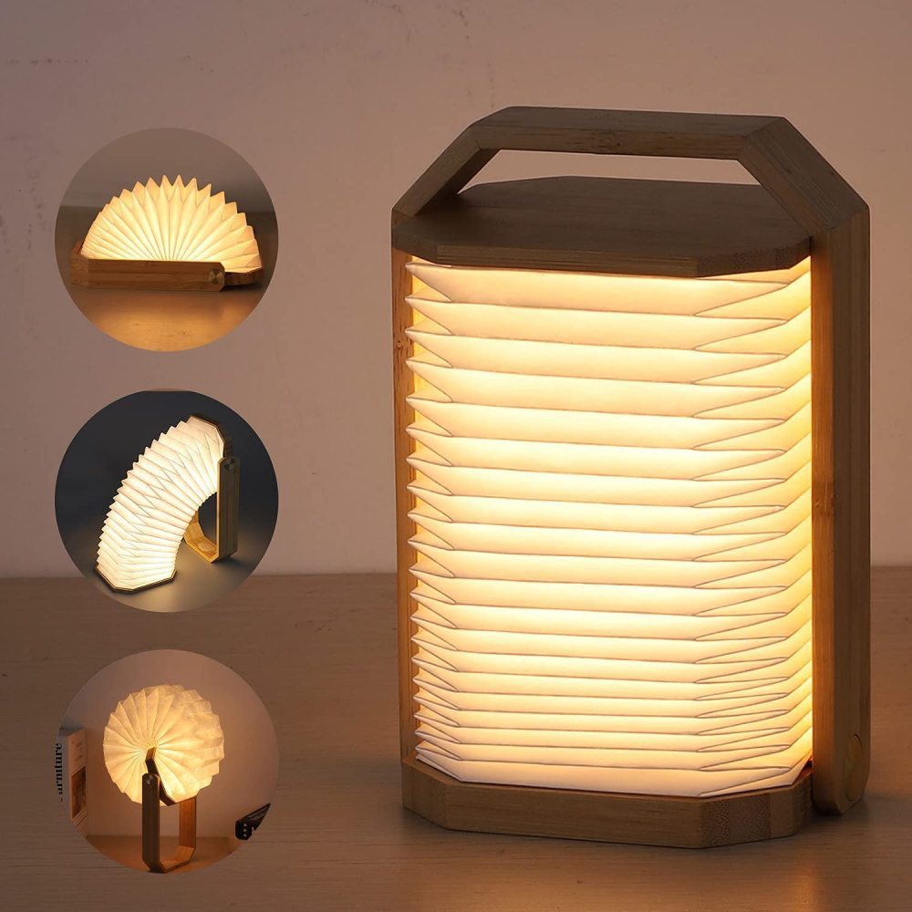 【Novelty Gift】 Foldable Book Lamp,【Long Battery Life】 Cordless Table Lamp,【Soft Ambient Glow】 Led Paper Lantern, 【Diverse Shapes】 Portable Lamp for Birthday Gift, Study, Bedside, Camp, Patio Material Upgrade:Made of durable Dupont paper and maple wood.Folding book light is water/high-temperature resistance with good light transparency.So you don't worry it will destroy easily and won‘t hurt you when you touch the book LED upgrade:The wooden light adopts advanced flicker-free and anti-glare warm yellow LED can protect your sensitive eyes from tiredness, and create a relaxed atmosphere.The light turns on when you open it and turns off when closing the book
